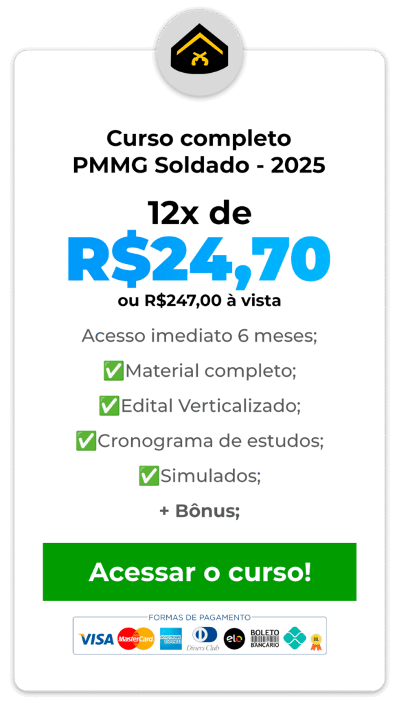 Tenha acesso a PDFs de todos os tópicos e videoaulas dos principais tópicos para sua preparação para o concurso da PMMG 2025.